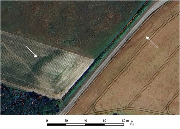 Figure 2: Google Earth aerial imagery showing cropmarks of two sections of buried ditch flanking the long barrow. ©Google and Airbus 2025.