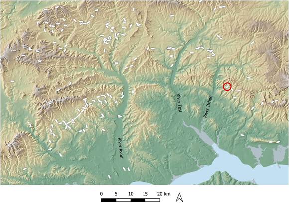 One further question is why such a large monument is located where it is. All of the other substantial long barrows and bank barrows are positioned in areas rich in Neolithic and later Bronze Age monuments, acting as important ceremonial landscapes that attracted activity for significant periods of time. In contrast, the area south-east of Winchester is hardly renowned for its Neolithic monuments, with a scattering of long barrows and later Bronze Age barrows. The Warren Farm long barrow stands at the north-west edge of a sparse scatter of long barrows east of the Itchen Valley (Figure 8).
