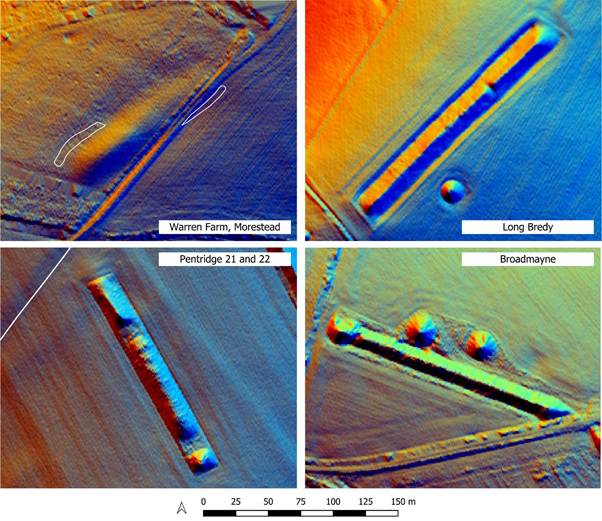 Figure 7: Comparison of Warren Farm long barrow with bank barrows in Dorset. Contains public sector information licensed under the Open Government Licence v3.0.