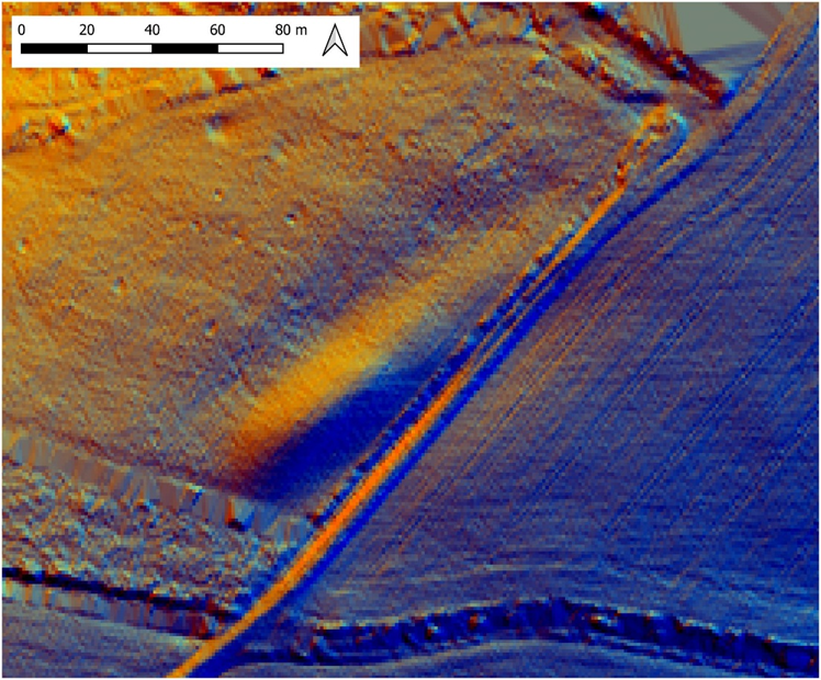 Figure 1: Multi-direction hillshade of LiDAR 1m DTM showing the Warren Farm long barrow. Contains public sector information licensed under the Open Government Licence v3.0.