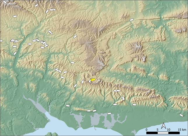 Figure 7: Distribution of long barrows in the region of East Meon. The East Meon long barrow is shown with a yellow symbol. Contains public sector information licensed under the Open Government Licence v3.0.
