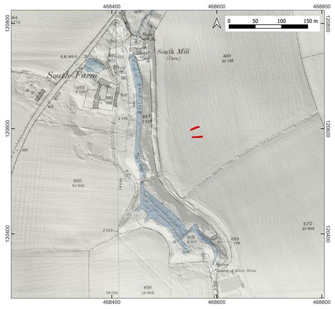 Figure 4: Ordnance Survey 6-inch map (revised 1895 and published 1896), draped over Lidar. The spring source of the River Meon is labelled. The location of the long barrow has been superimposed in red. Contains public sector information licensed under the Open Government Licence v3.0