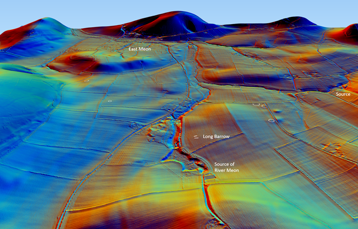 Figure 6: 3D view of the topographic location of the long barrow at the source of the River Meon. Contains public sector information licensed under the Open Government Licence v3.0.