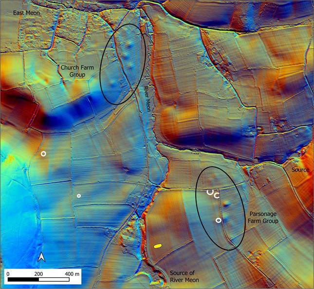 Returning to the long barrow at the source of the Meon, the barrow itself did not directly attract later Bronze Age funerary monuments, but taking a slightly wider view, significant concentrations of apparent Bronze Age barrows are located not far away, underlining the importance of the river and its spring sources in prehistoric times. These probable Bronze Age barrows were noted in a comprehensive and valuable survey of barrows in the Petersfield area, and were named the Church Farm Group, adjacent to the River Meon near East Meon, and the Parsonage Farm Group, located between the recognised source of the Meon and the spring source of a small tributary (Needham & Anelay 2021: 546–47). These are shown in Figure 5, which also shows the locations of ring ditches revealed by aerial imagery. Figure 6 provides a 3D view of the same area.