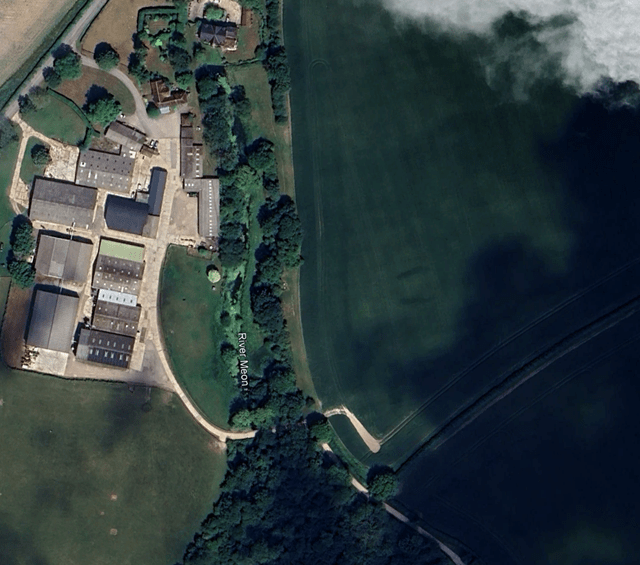 Figure 2: Aerial image showing the cropmarks of the flanking ditches of the recently discovered long barrow, just right of centre. Google Earth Imagery dated 30/06/2025 ©Google