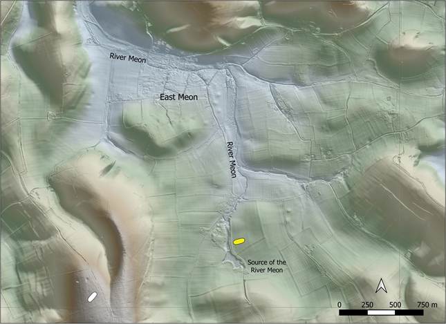 Figure 1: Map showing the location of the recently discovered long barrow, shown with a yellow symbol, near the source of the River Meon. The location of the nearby Salt Hill long barrow is shown with a white symbol. Contains public sector information licensed under the Open Government Licence v3.0.